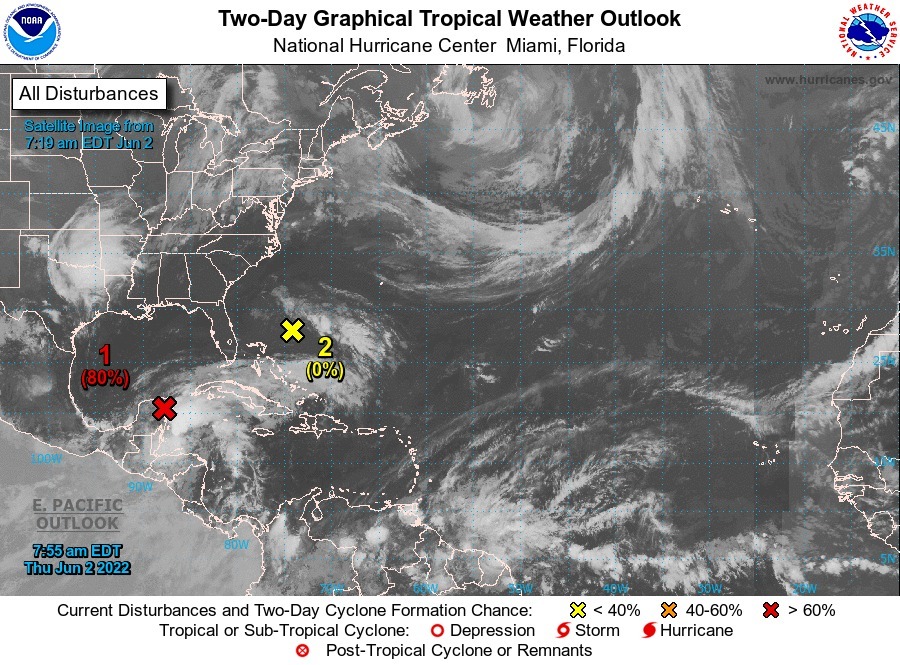 En la mañana de este jueves, NHC (Centro Nacional de Huracanes) está monitoreando de cerca una amplia zona de baja presión ubicada sobre la porción noreste de la península de Yucatán continúa produciendo una gran área de lluvias desorganizadas y tormentas eléctricas sobre el noroeste del Caribe en el mar y la península de Yucatán.