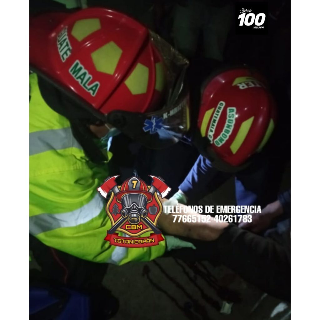 Elementos de Bomberos Municipales Departamentales a bordo de la unidad RD-32, inmediatamente acudieron a prestarle los primeros auxilios ya que presentaba fractura expuesta de tibia y peroné izquierdo, fue trasladado a un hospital privado de Totonicapán.