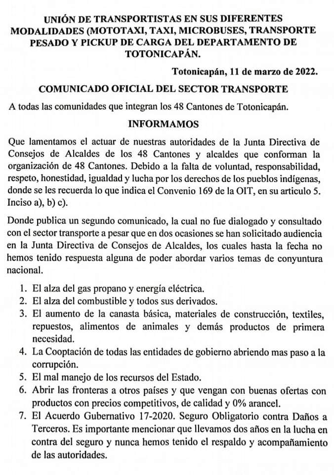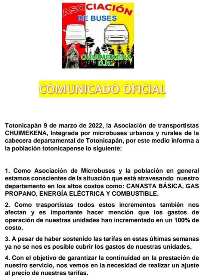 En los últimos días se han emitidos comunicados por parte de transportistas sobre el precio del pasaje, específicamente en microbuses que prestan servicio en la cabecera departamental de Totonicapán, afirman que ya no les es posible cubrir los gastos de las unidades.