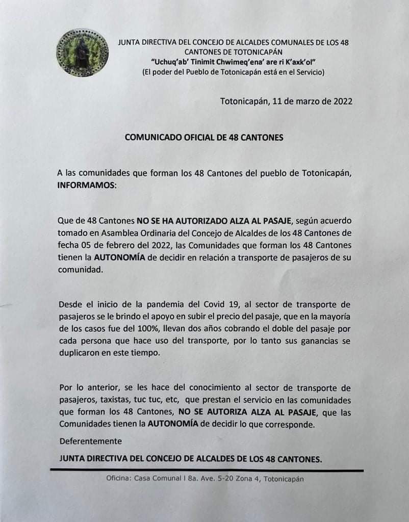 La junta de alcaldes de la organización 48 Cantones, emitió un comunicado indicando que no se ha autorizado ningún aumento del pasaje que respecta al transporte local ( casco urbano y comunidades).