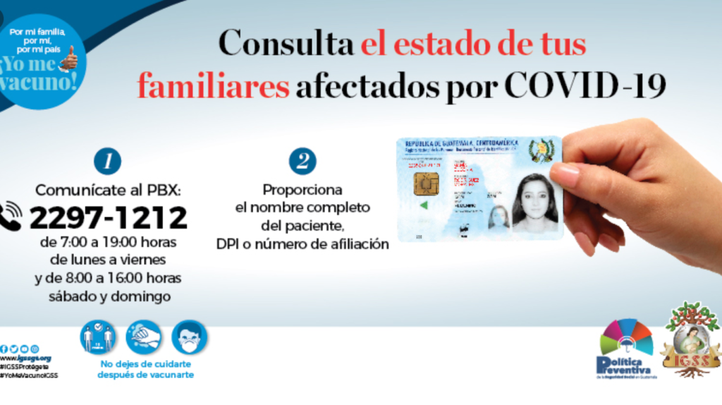 El IGSS comunica también que para averiguar sobre el estado de salud de familiares afectados por COVID-19, se debe llamar al Tel. 2297-1212. Servicio de información de lunes a viernes de 7:00 a 19:00 horas, sábado y domingo de 8:00 a 16:00 horas.