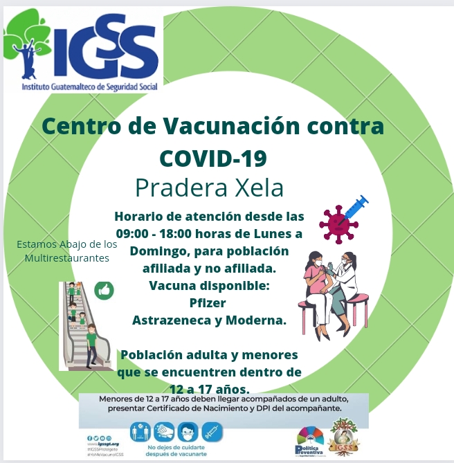 El Instituto Guatemalteco del Seguro Social (IGSS) de Coatepeque, informa que se habilita puesto de vacunación contra el Coronavirus COVID-19 en el Centro Comercial Pradera Xela, ubicado en la zona 3 de la ciudad de Quetzaltenango.