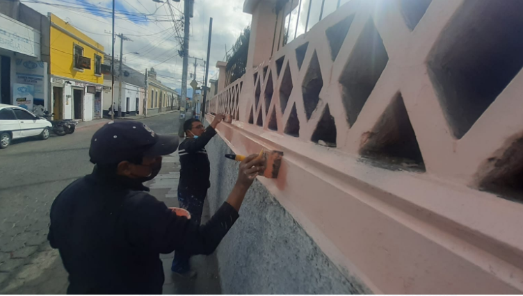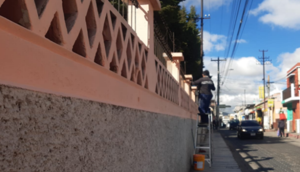 Padres y personal de la Escuela Soledad España, zona 1 de Quetzaltenango, desarrollan trabajos de remozamiento en las instalaciones del centro educativo.