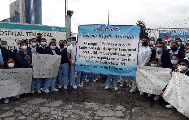 «Licenciada Nohemí Reyes Andrade, el grupo de supervisores de enfermería del Hospital Temporal del Covid-19 Quetzaltenango le apoya y respalda en su gestión como subdirectora del Departamento de Enfermería», se lee en una de las pancartas.