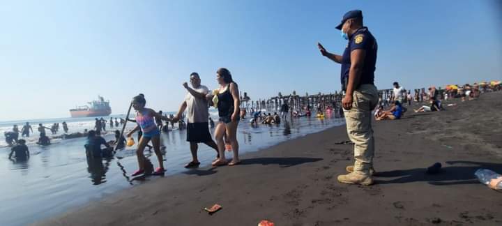 Agentes de la División de Seguridad Turística (Disetur) de la Policía Nacional Civil (PNC) brindan seguridad a turistas en las playas públicas del sur de Guatemala.