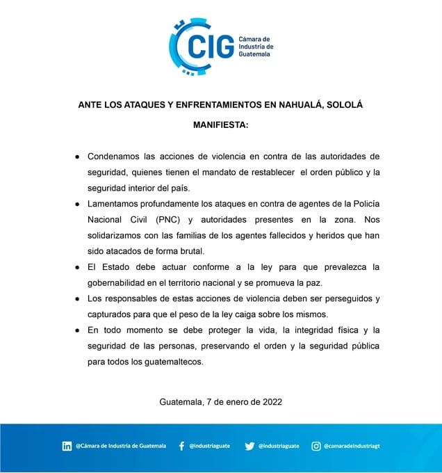La Cámara de la Industria de Guatemala emitió un comunicado en donde condenaron las acciones de violencia en contra de autoridades de seguridad este viernes 07 de enero de 2022, cuando iniciaban una serie de allanamientos, en donde se tenía previsto ejecutar 65 allanamientos y efectuar cuatro órdenes de captura.