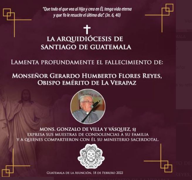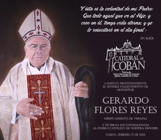 «Lamentamos el sensible fallecimiento de Monseñor Gerardo Humberto Flores Reyes, Obispo emérito de La Verapaz. Yo soy la resurrección y la vida; el que cree en mí, aunque esté muerto, vivirá, San Juan 11.2», se lee en la esquela publicada en redes sociales por el Arzobispado.