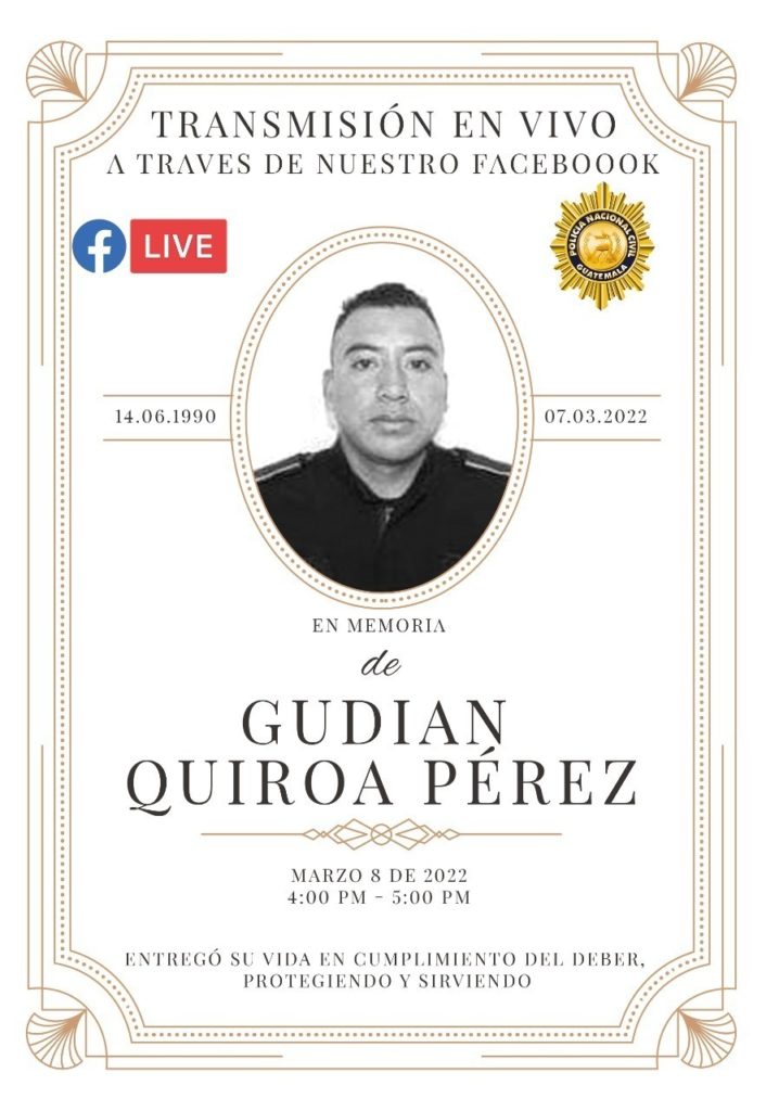 Gudian Oliverio Quiroa Pérez, agente de la Policía Nacional Civil (PNC) fue asesinado a balazos el pasado lunes 07 de marzo en el departamento de Guatemala.