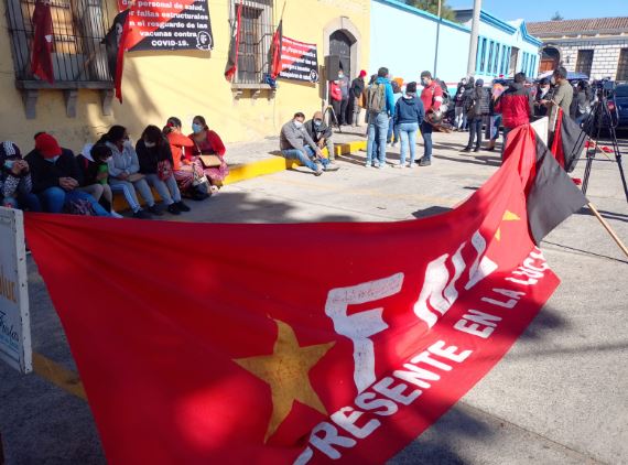 En las mantas colocadas afuera del Área de Salud se indica que los sindicalistas están en contra de la «criminalización» al personal de salud por el resguardo de la vacuna contra el COVID-19.