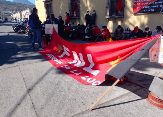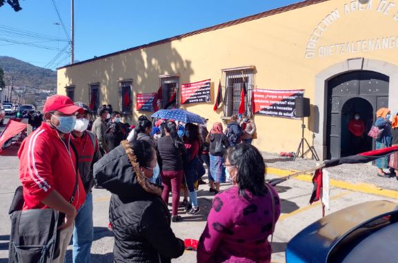 Este lunes, integrantes del Sindicato de Trabajadores de Salud colocan mantas frente al Área de Salud de Quetzaltenango, en la 14 avenida, zona 1 de Xela.