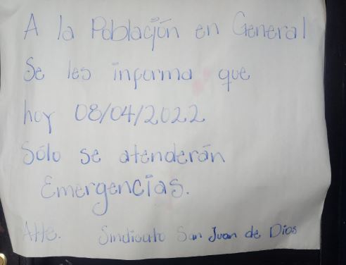 «A la población en general se le informa que hoy 08/04/2022 solo se atenderán emergencias. Atte Sindicato San Juan De Dios», se lee en un rótulo colocado en el ingreso al CAP.