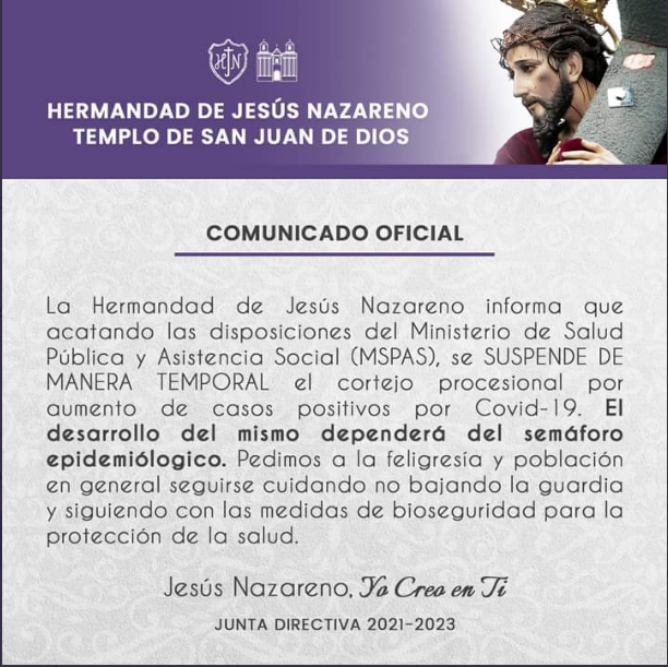 Este lunes, Ariel Tay, de la Hermandad de Jesús Nazareno del Templo San Juan de Dios, zona 1 de Quetzaltenango, informó que mantienen la decisión de suspender de manera temporal el cortejo procesional.