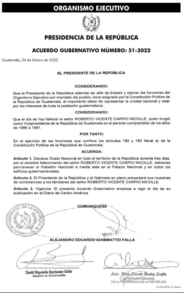 El presidente Alejandro Giammattei emitió el Acuerdo Gubernativo 51 – 2022 en el que declara duelo nacional por la muerte del exvicepresidente Roberto Carpio Nicolle, ocurrida el jueves 24 de febrero.