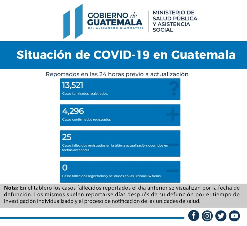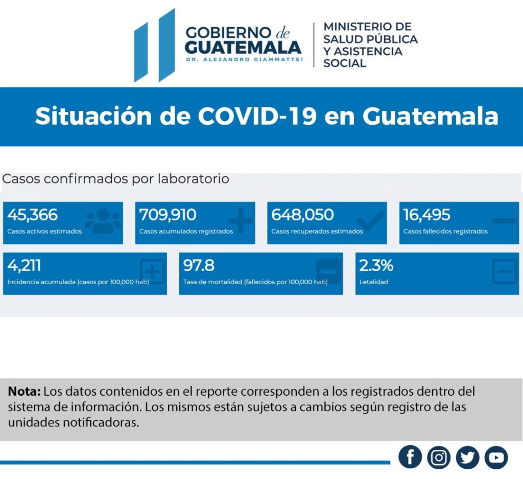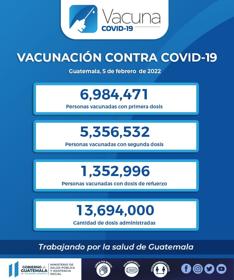 La cartera de Salud también informa este 5 de febrero de 2022, los casos confirmados por laboratorio en el tablero situación COVID-19 en Guatemala. Corresponde al 4 de febrero de 2022 de 00:00 a 23:59 horas.