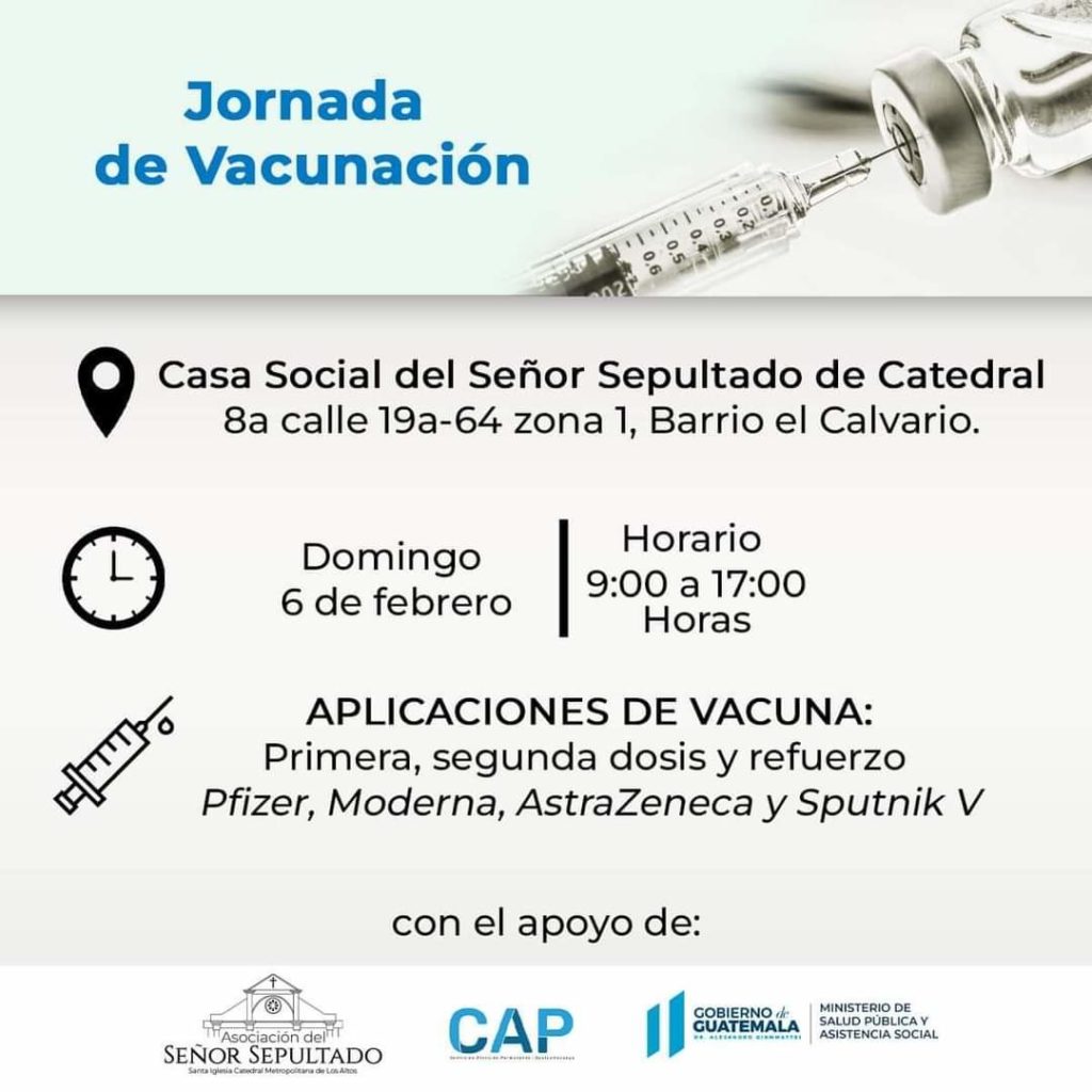 Para este domingo 06 de febrero, de 9.00 a 17.00 horas se tiene programada una jornada de vacunación contra el Coronavirus COVID-19 en el Salón Social de la Hermandad del Señor Sepultado de Catedral Metropolitana de los Altos.