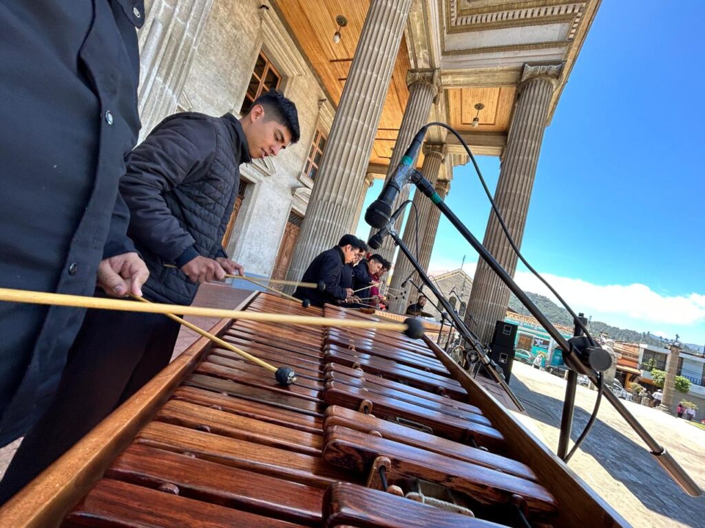 En el frontispicio del Teatro Municipal de Quetzaltenango, se desarrolló el concierto de marimba, a cargo de la marimba de concierto de la municipalidad de Quetzaltenango, por su 128 aniversario, iniciando con una alborada acompañada de mariachis.