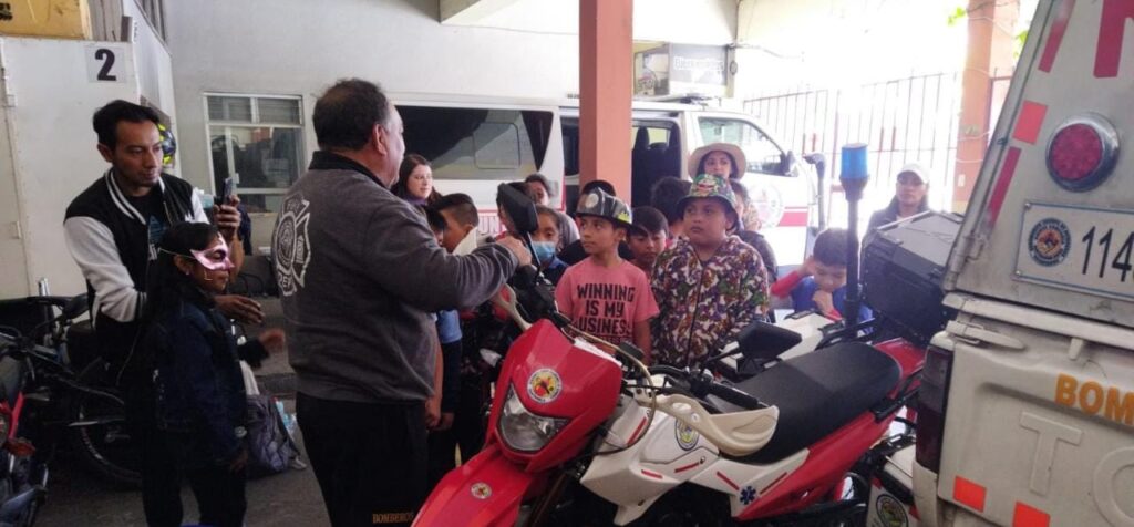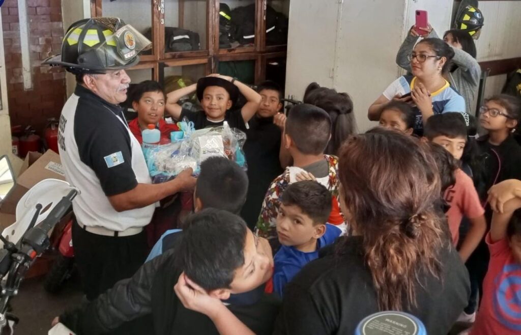 Niños visitan la quinta compañía de bomberos voluntarios de Quetzaltenango.