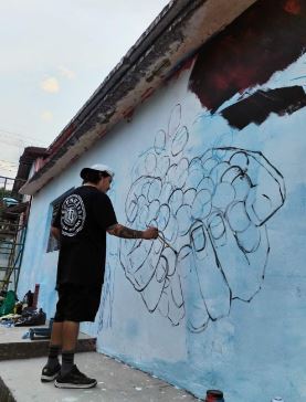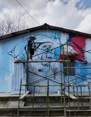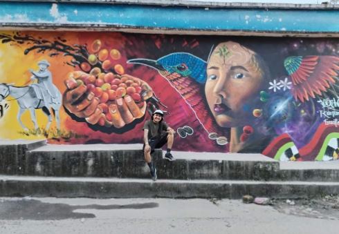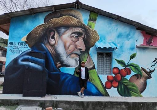 Los artistas de murales, Billi Cotuc y José Chavajay, originarios de San Pedro La Laguna, Sololá, participan en un festival en Colombia, en el cual plasmaron una pintura que se fusiona para recrear el proceso de producción del café.
