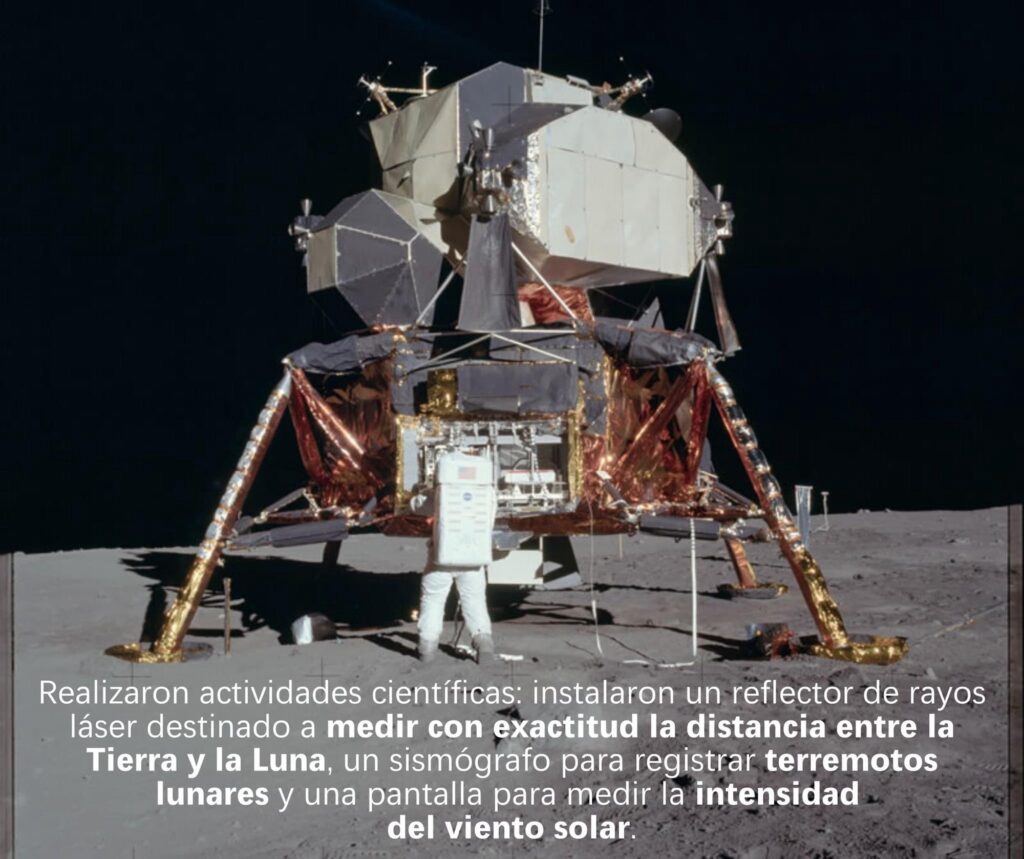 Los astronautas recorren el terreno por más de dos horas recogiendo 22 kilogramos de muestras de suelo y rocas lunares e instalando instrumental científico para detección de sismos, partículas solares y un reflector láser.