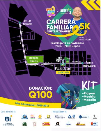 La carrera será el 10 de noviembre de 2024, a partir de las 7 horas, y la salida y meta es en la Plaza Japón, zona 3 de Quetzaltenango. La donación para participar es de Q100 y para más información se pueden comunicar al número telefónico 50178912.