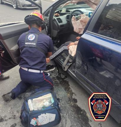 Bomberos Municipales Departamentales de Totonicapán le brindan primeros auxilios a la conductora del vehículo sedán.