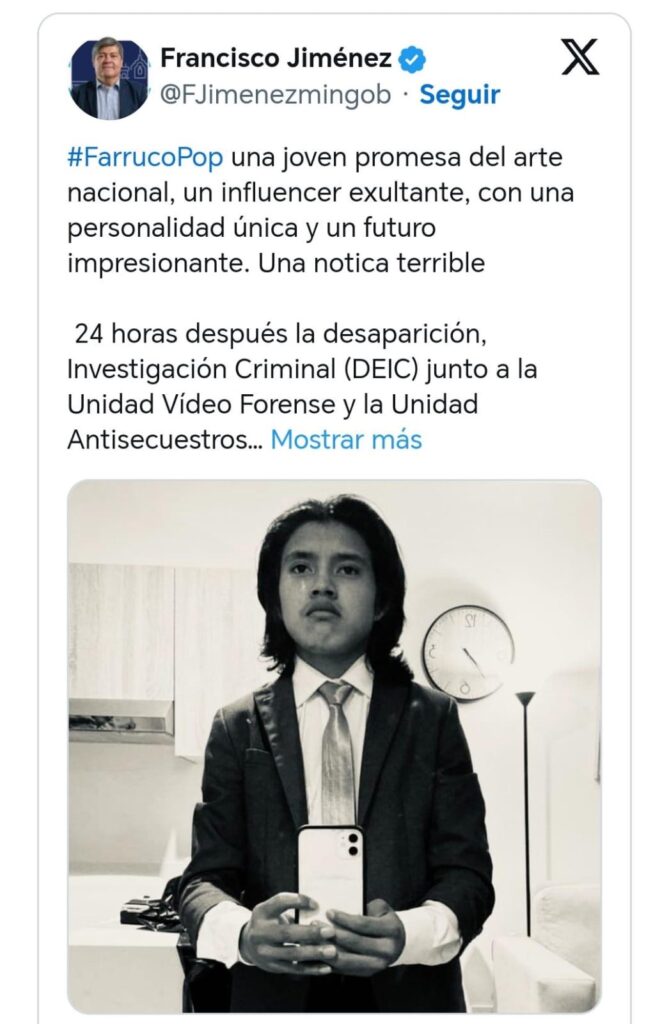 Ministro de Gobernación, Francisco Jiménez, informó sobre acciones desarrolladas para dar con el paradero de Farruko Pop.