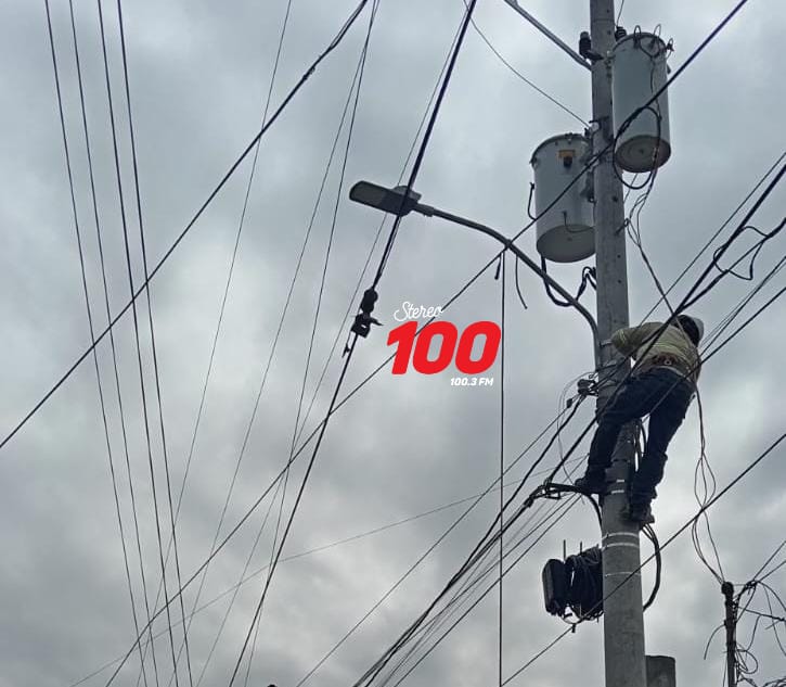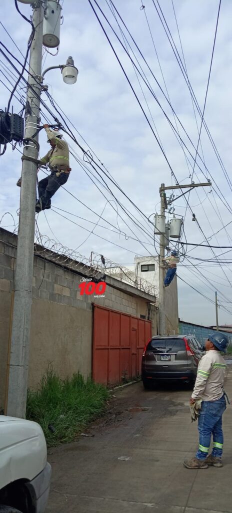 Técnicos de la Empresa Eléctrica Municipal de Quetzaltenango (EEMQ) cambian ocho luminarias en la diagonal 1 y 10ª calle, Las Tapias, zona 8 de Xela.