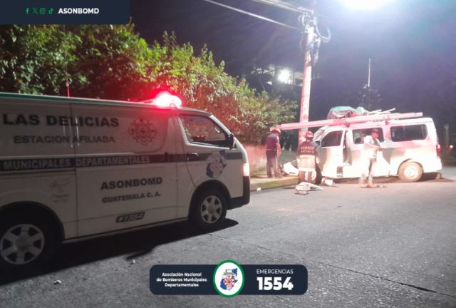 Este jueves Bomberos Municipales Departamentales del cantón Las Delicias, Colomba Costa Cuca, Quetzaltenango, trasladan al Instituto Guatemalteco de Seguridad Social (IGSS) a cinco personas, quienes resultaron heridas cuando el microbús P-669 JWB en el que viajaban colisionó contra un poste.