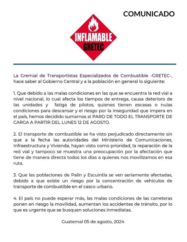 Gremiales de transporte pesado amenazan con un paro de labores para el siguiente lunes debido al mal estado de la red de carreteras a nivel nacional (principalmente carretera Palín Escuintla) y la inseguridad que esto ocasiona.