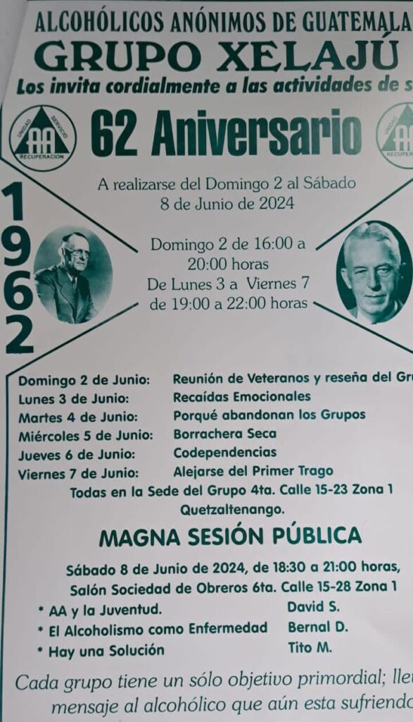 El Grupo Xelajú de Alcohólicos Anónimos de Guatemala cumple 62 años en Quetzaltenango, por ello, organizan varias actividades con los distintos grupos e integrantes de esta asociación.