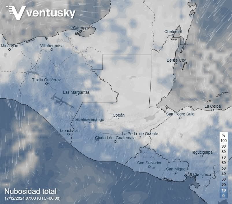 Persistiendo influencia de un sistema de alta presión del Norte al Centro del país y el ingreso de humedad del mar Caribe, continuarán los nublados en el Caribe, Sur de Petén y Oeste de la Franja Transversal del Norte. Mientras que, la velocidad del viento podría variar entre los 25 a los 35 kilómetros por hora, en las regiones del Altiplano Central y Valles de Oriente.