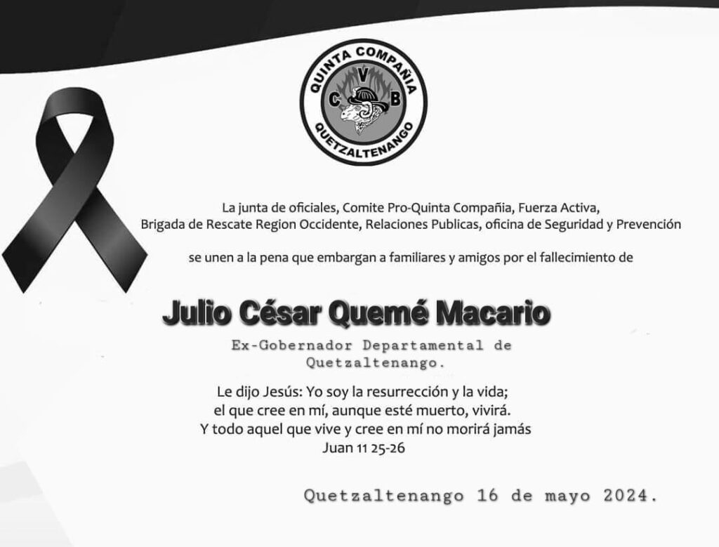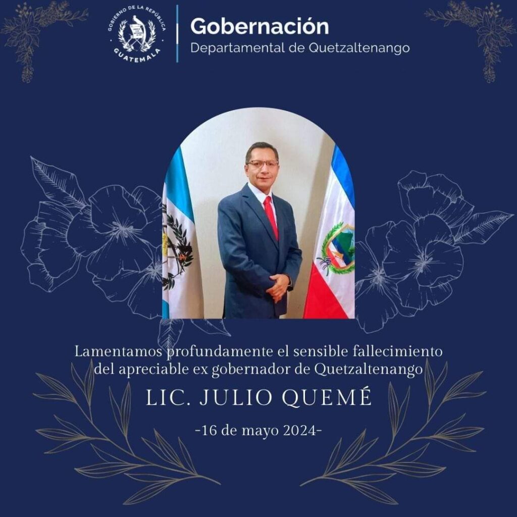 El jueves reciente por la noche, cerca de las 20.30 horas, el exgobernador de Quetzaltenango, Julio César Quemé Macario, de 53 años, murió en un accidente de tránsito en el centro de San Miguel Sigüilá, Quetzaltenango.