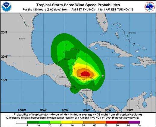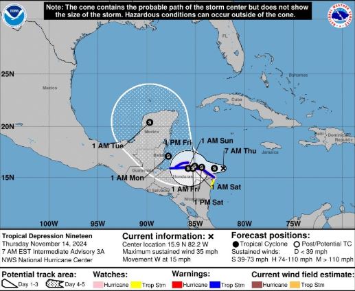 El sistema ciclónico tropical diecinueve se ha intensificado y ahora es una depresión tropical, de acuerdo con el monitoreo del Instituto Nacional de Sismología, Vulcanología, Meteorología e Hidrología (Insivumeh).