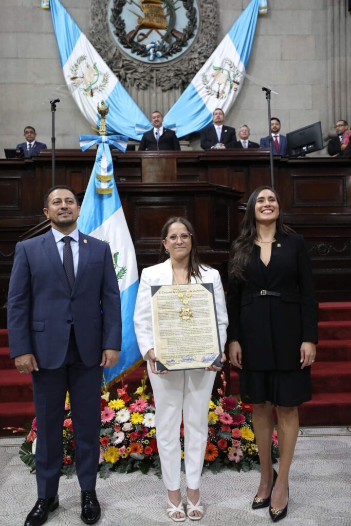 El presidente del Congreso de la República de Guatemala, Nery Ramos, y la diputada, Karina Paz, Primera Secretaria del Congreso, confieren la Orden del Soberano Congreso Nacional en el grado de Gran Collar a la atleta guatemalteca, Adriana Ruano Oliva, quien ganó la histórica medalla de oro en tiro deportivo.