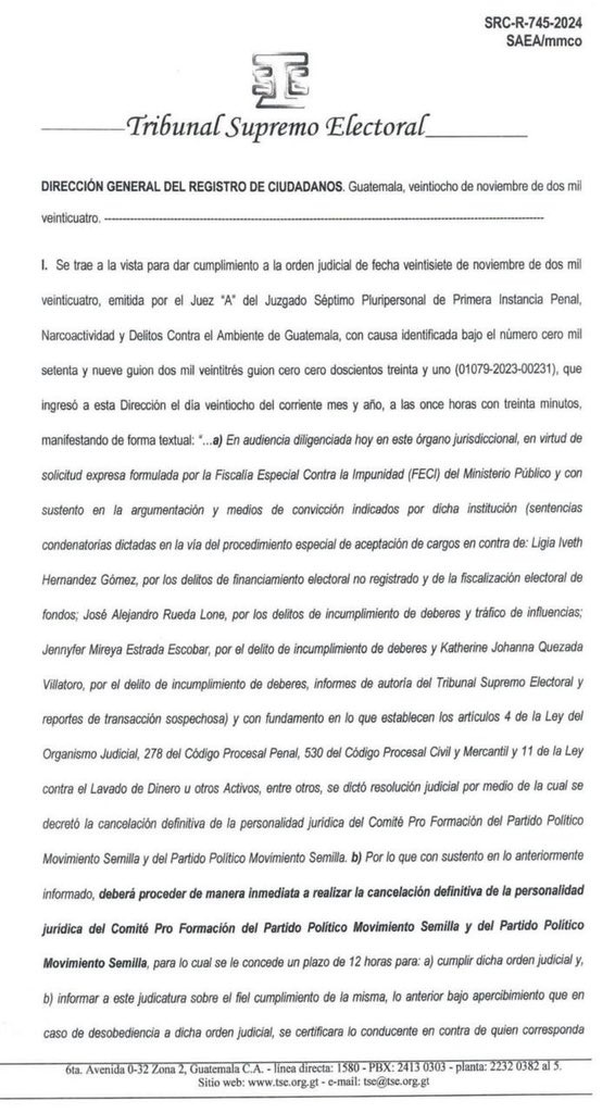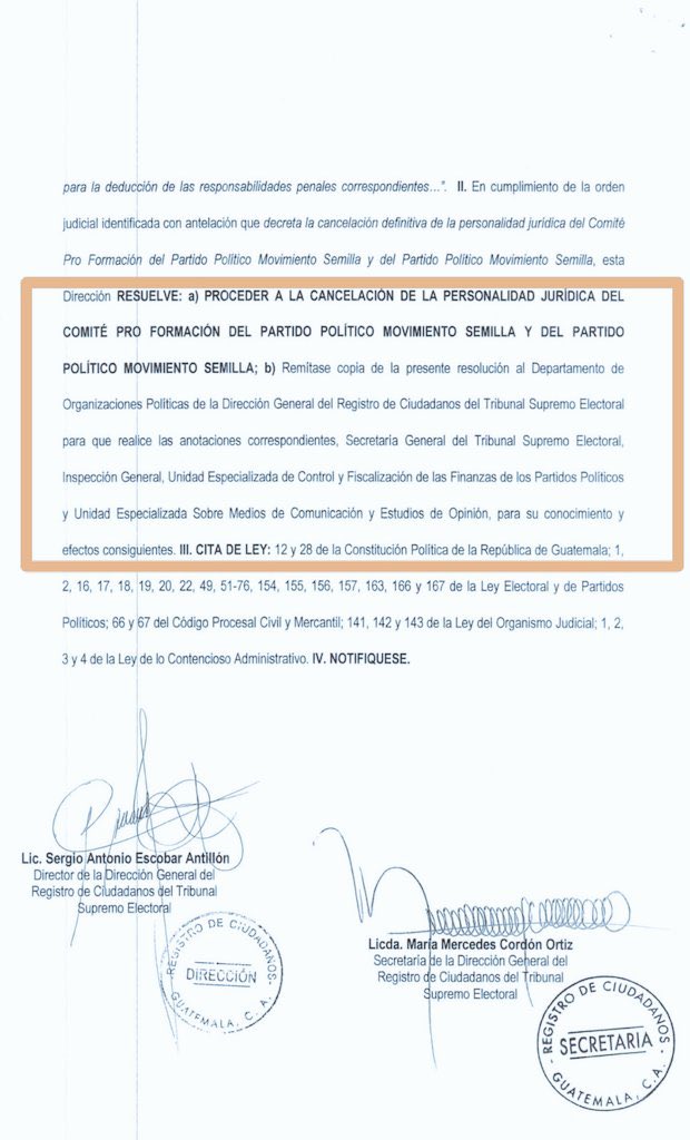 Este viernes el Registro de Ciudadanos del Tribunal Supremo Electoral (TSE) cumplió con la resolución del juez séptimo, Fredy Orellana, y procedió a la cancelación del partido político Movimiento Semilla, el cual llevó a la Presidencia de Guatemala a Bernardo Arévalo.