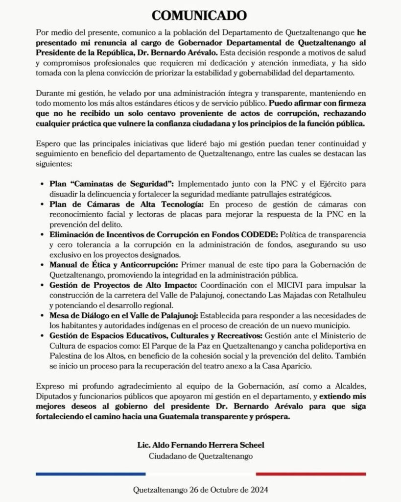 Por medio de un comunicado el gobernador de Quetzaltenango, Aldo Herrera, le ha presentado su renuncia al presidente de Guatemala, Bernardo Arevalo. Dicha decisión se tomá según el documento, por problemas de salud y compromisos profesionales.