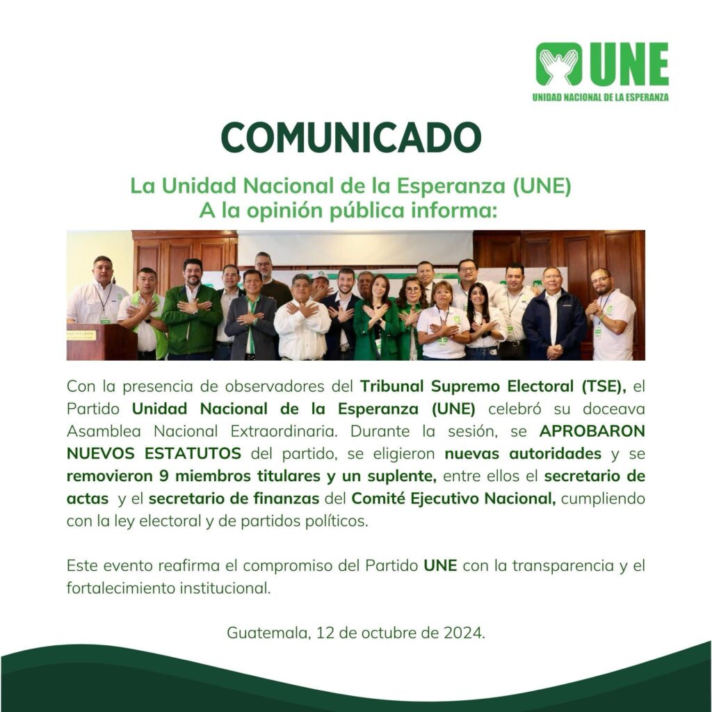 Sandra Torres es confirmada como secretaria ejecutiva nacional de la UNE. Removieron del Comité Ejecutivo Nacional (CEN) a nueve miembros de la organización, encabezados por el diputado Adim Maldonado, quien fungía como secretario de actas y con quien Torres mantenía disputa este año.
