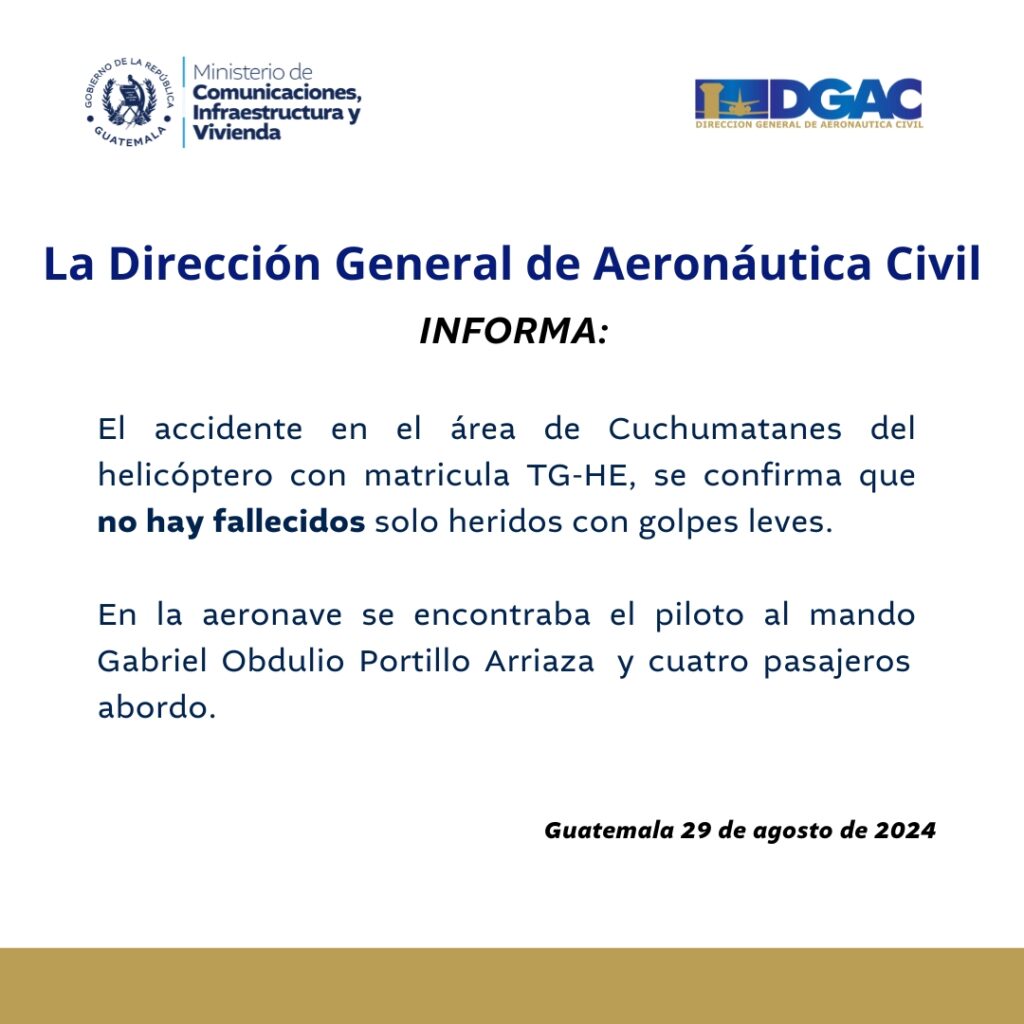 La DGAC indicó que en el helicóptero viajaba el piloto, Gabriel Obdulio Portillo Arriaza, y cuatro pasajeros.