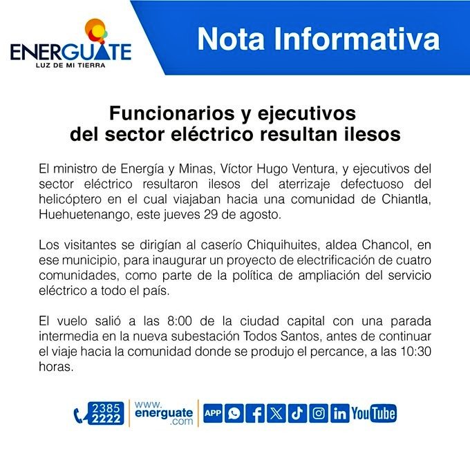 Este jueves, el helicóptero donde viajaba el ministro de Energía y Minas, Víctor Hugo Ventura, y otros ejecutivos del sector eléctrico, efectúa un «aterrizaje defectuoso» en Huehuetenango.