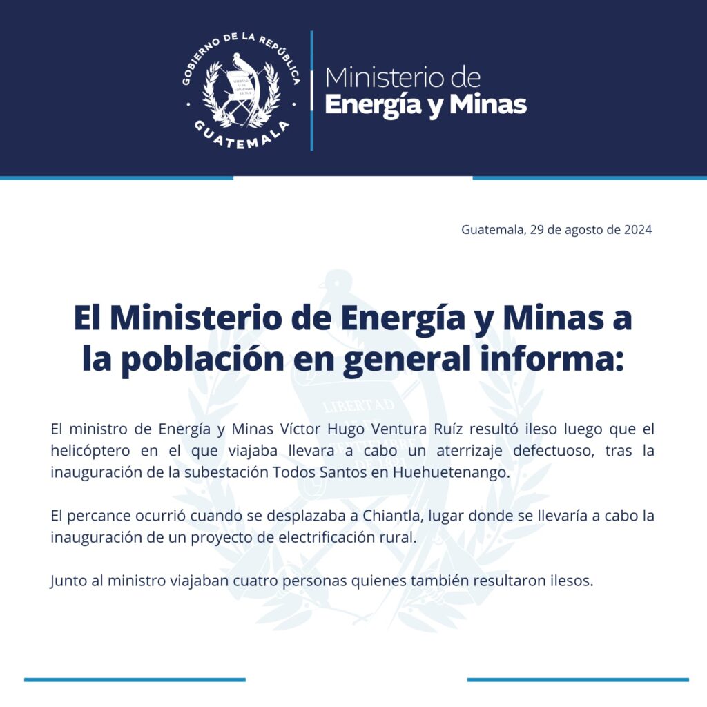 El Ministerio de Energía y Minas (MEM), en un comunicado, informó que Ventura salió ileso y que el accidente cuando se dirigía a Chiantla para inaugurar un proyecto de electrificación rural.