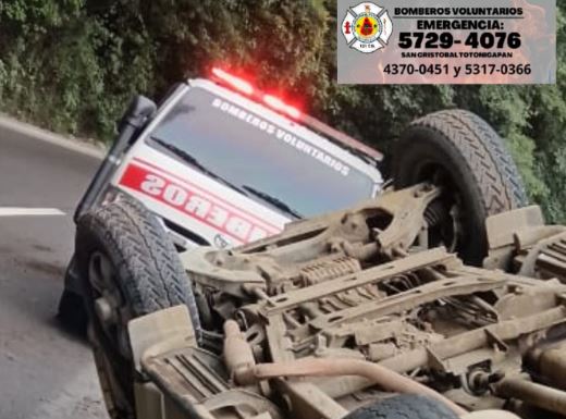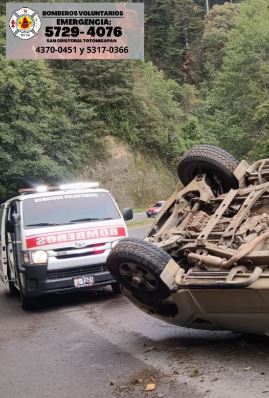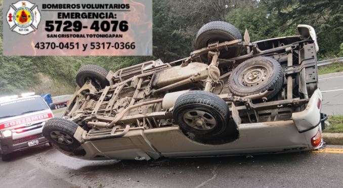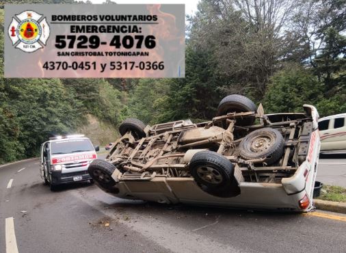Este viernes un vehículo, por causas que se desconocen, volcó en el kilómetro 174 de la ruta CA-1, carretera que comunica Cuatro Caminos, San Cristóbal, Totonicapán, y la capital.