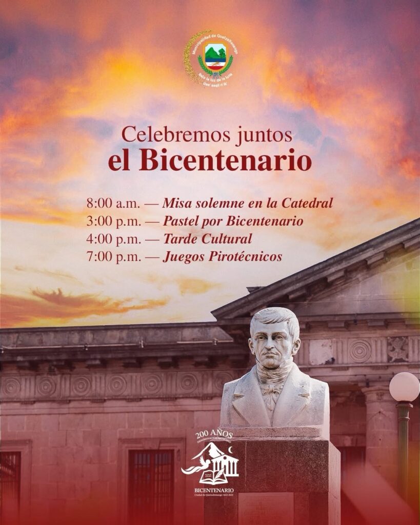 Las actividades oficiales iniciarán a las 8:00 a.m. con una misa en Catedral, seguida por la izada de banderas a las 9:00 a.m.. Al mediodía se realizará la Sesión Solemne en honor al Bicentenario, mientras que por la tarde se ofrecerá un pastel conmemorativo en el frontispicio municipal a las 3:00 p.m., una tarde cultural a las 4:00 p.m., juegos pirotécnicos a las 7:00 p.m. y el partido de fútbol (Xelajú Vs Real España) en pantalla gigante para el cierre a las 8:00 p.m.
