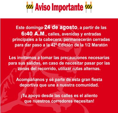 «Les invitamos a tomar las precauciones necesarias para sus salidas, en caso de necesitar pasar por las zonas del recorrido, utilizar rutas alternas», indica el comunicado emitido por los organizadores.
