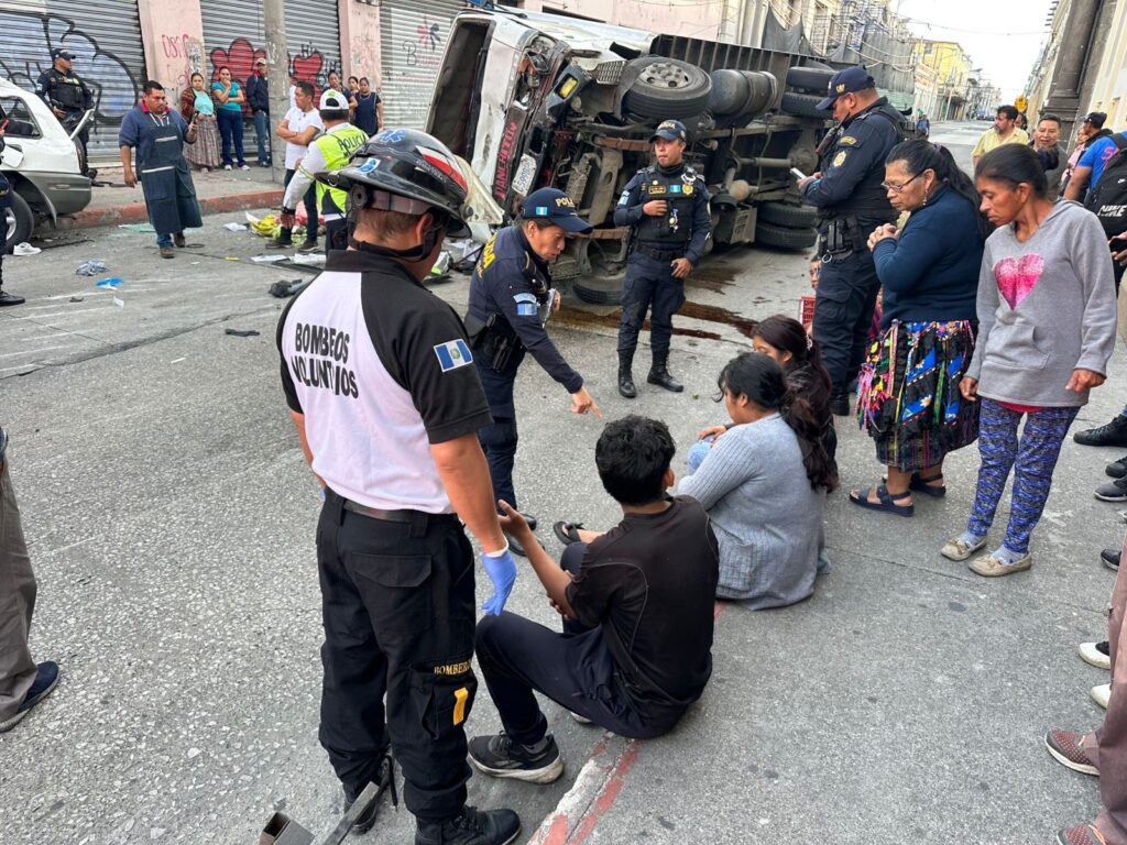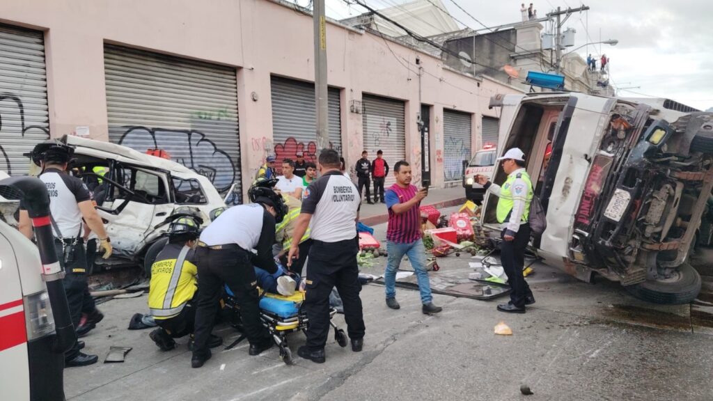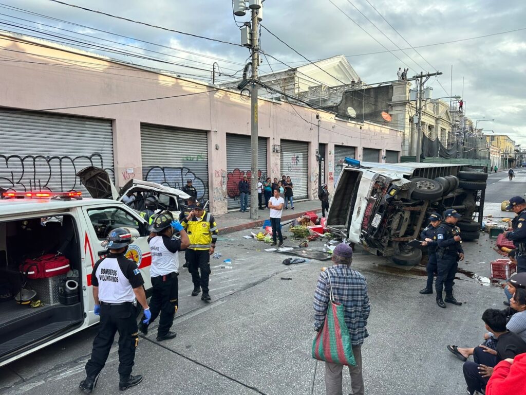 Un fuerte accidente de tránsito entre un camión cargado con frutas y verduras y una camioneta tipo agrícola se registró la mañana de este sábado, 19 de julio, frente al Congreso de la República, en la 10 calle y 9 avenida, zona 1 capitalina.