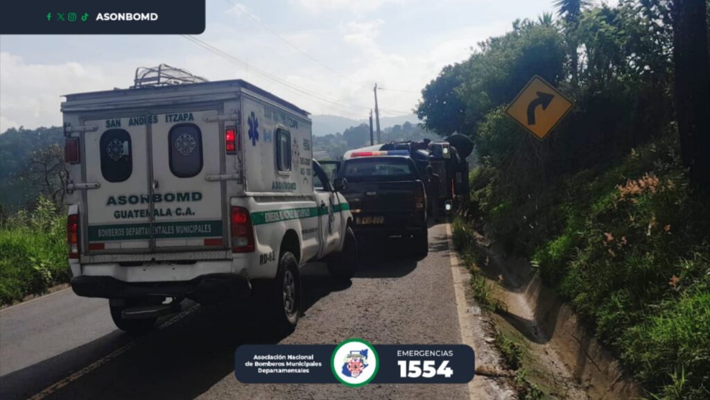 Bomberos atienden la emergencia y trasladan a una persona herida al hospital nacional de Chimaltenango.