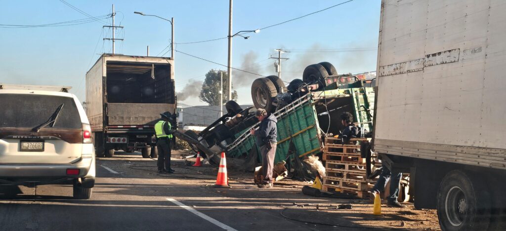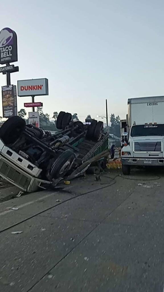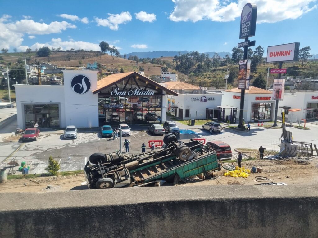 Anoche, cerca de las 23.46 horas, un camión que transportaba aceite para cocinar, volcó en el kilómetro 195.5, paso a desnivel de Salcajá, Quetzaltenango.