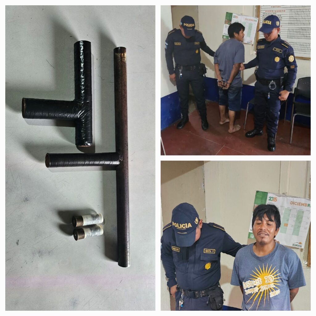 Según el informe policial, el individuo fue sorprendido en flagrancia portando en su espalda un maletín color azul, en cuyo interior se localizaron dos tubos de metal utilizados como arma hechiza, así como cartuchos calibre 12.