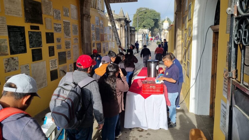 Esta mañana, personal del Cementerio General de Quetzaltenango recibió a los visitantes con café y pan, como parte de una actividad que realizan cada lunes durante esta temporada. El objetivo es brindar apoyo y un gesto de cercanía a las familias que visitan a sus seres queridos, así como a las personas que realizan labores de mantenimiento en los nichos.