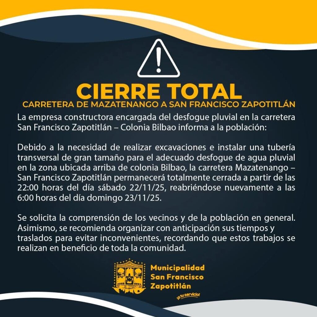Las autoridades municipales de San Francisco Zapotitlán, en Suchitepéquez, informaron que este fin de semana se realizará el cierre total de la ruta que comunica Mazatenango hacia San Francisco Zapotitlán, debido a trabajos de infraestructura que requieren bloquear completamente el paso vehicular.