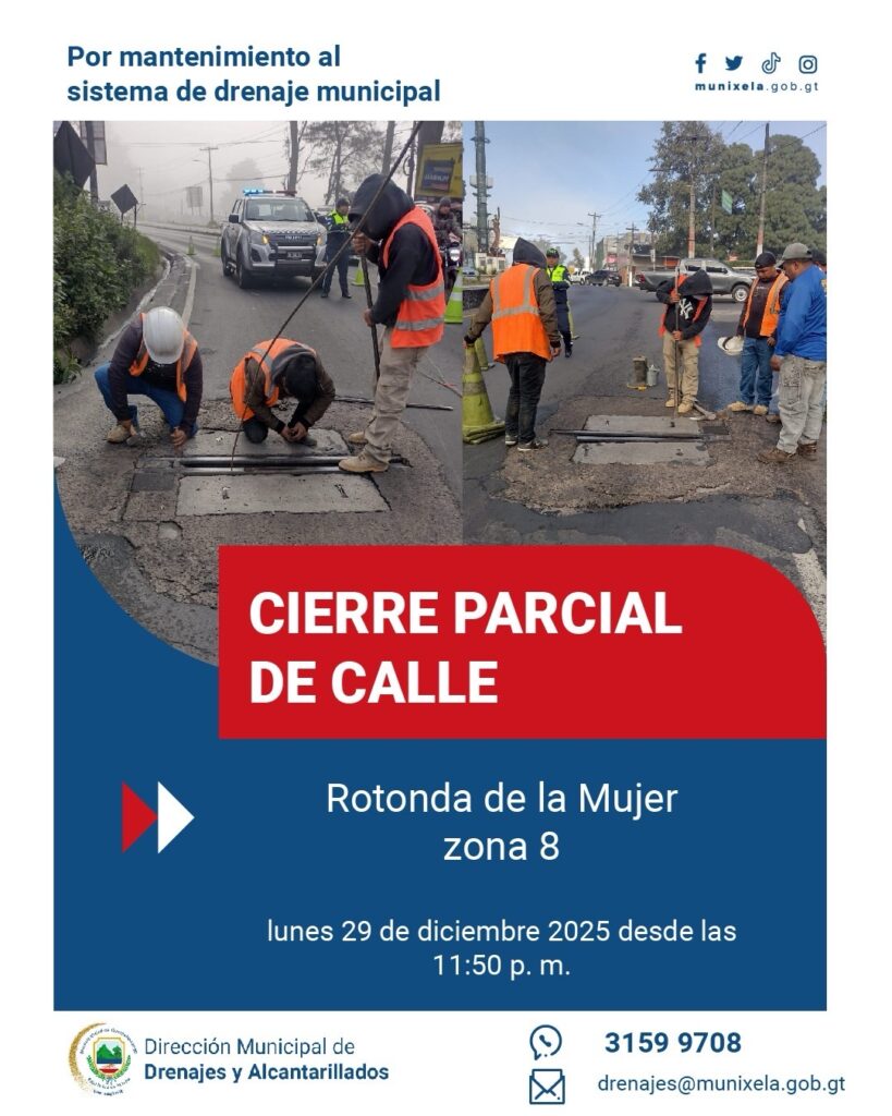 La Dirección Municipal de Drenajes y Alcantarillados (DMA) informó que, debido a trabajos de mantenimiento al sistema de drenaje municipal, a cargo del personal de la Jefatura de Campo e Infraestructura de la DMA, se realizará el cierre de un carril en la vía que conduce hacia Interplaza, a la altura de la rotonda de la Mujer, zona 8.